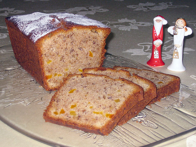 Aprikosen würfeln und nach Belieben in Rum einweichen. Margarine, Zucker, Vanillezucker und Eier schaumig rühren, Honig hinzugeben. Mehl und Backpulver sieben, Zimt, Nelken- und Ingwerpulver untermischen. Dieses nach und nach unterrühren. Die gehackten Walnüsse und die gewürfelten Aprikosen unter den Teig heben. Eine Kastenform mit Margarine gut einfetten und den Teig einfüllen.